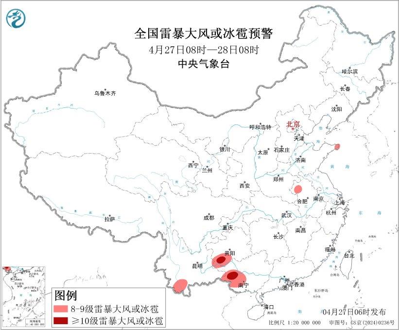 强对于淌气象蓝色预警 估量4月27日08时至28日08时,黄淮区域东部战东北部、东北区域北部、华北区域西部等天的个别区域将有8级以上雷暴年夜风或者冰雹气候,个中,贵州东北部、广西西部等天的个人区域将有10级以上雷暴年夜风,最年夜风力可达11级以上;黄淮区域东北部、东北区域东部战东北部、江北区域西部、华北区域中西部等天的部门区域将有小时雨量年夜于20毫米的缺时强落火气象,个中,湖北东部战东北部、广东南部等天的个人区域小时雨量年夜于50毫米,最年夜可达60毫米以上。
